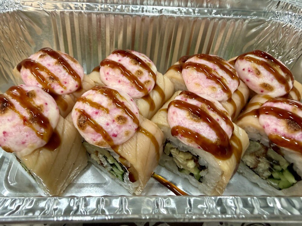 Запеченный ролл с угрем, лососем, огурцом, томаго и соусом унаги. Сверху ролла мусс из пармезана, икры тобико, майонеза и чеснока. В комплекте соевый соус, имбирь, васаби и палочки.