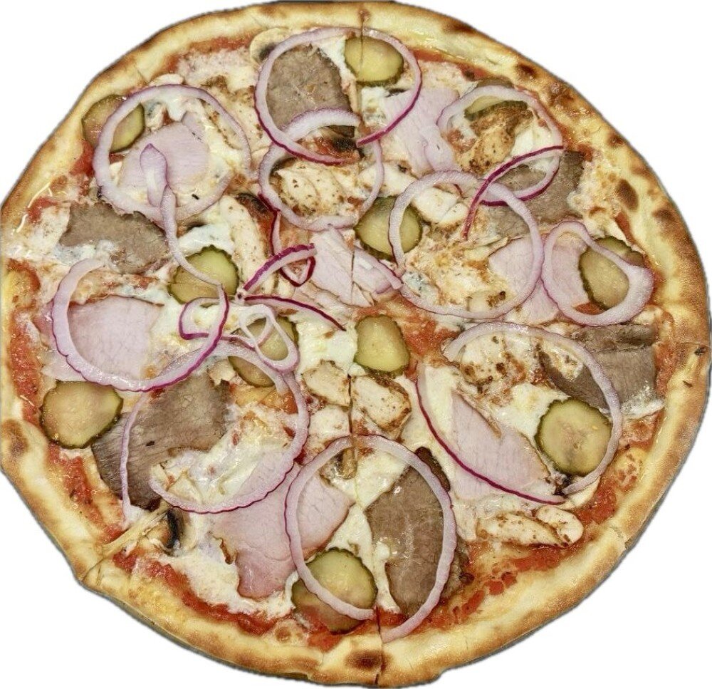 Пицца "Мясная" 33 см. Тонкое и хрустящее тесто на оливковом масле, ростбиф из говядины, бекон, куриное филе запеченное, лук ялтинский, шампиньоны, моцарелла, огурцы соленые, соус из томатов в собственном соку. Все продукты натуральные, соления собственного производства, без добавок, без ЗМЖ.