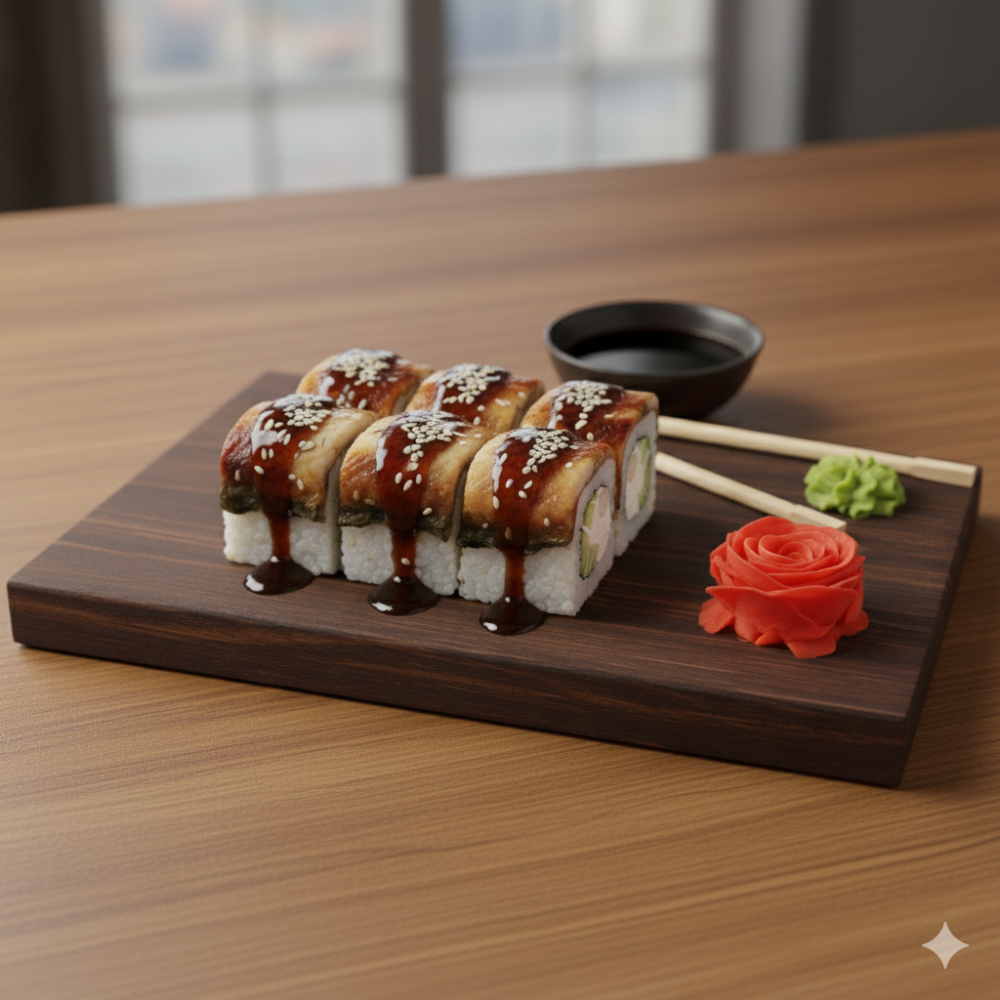 Ролл с угрем, тигровой креветкой темпура, свежим огурцом, творожным сыром, дайконом и соусом унаги. В комплекте соевый соус, имбирь, васаби и палочки.