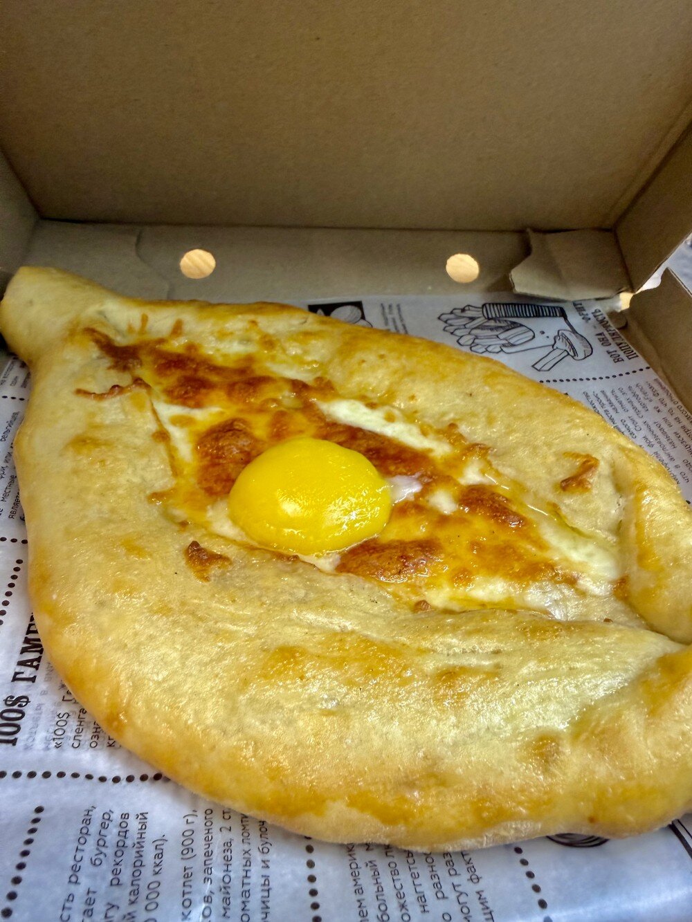 Хачапури по-аджарски. Открытый пирог из пышного теста, сыр сулугуни, сыр моцарелла, яйцо куриное и сливочное масло.