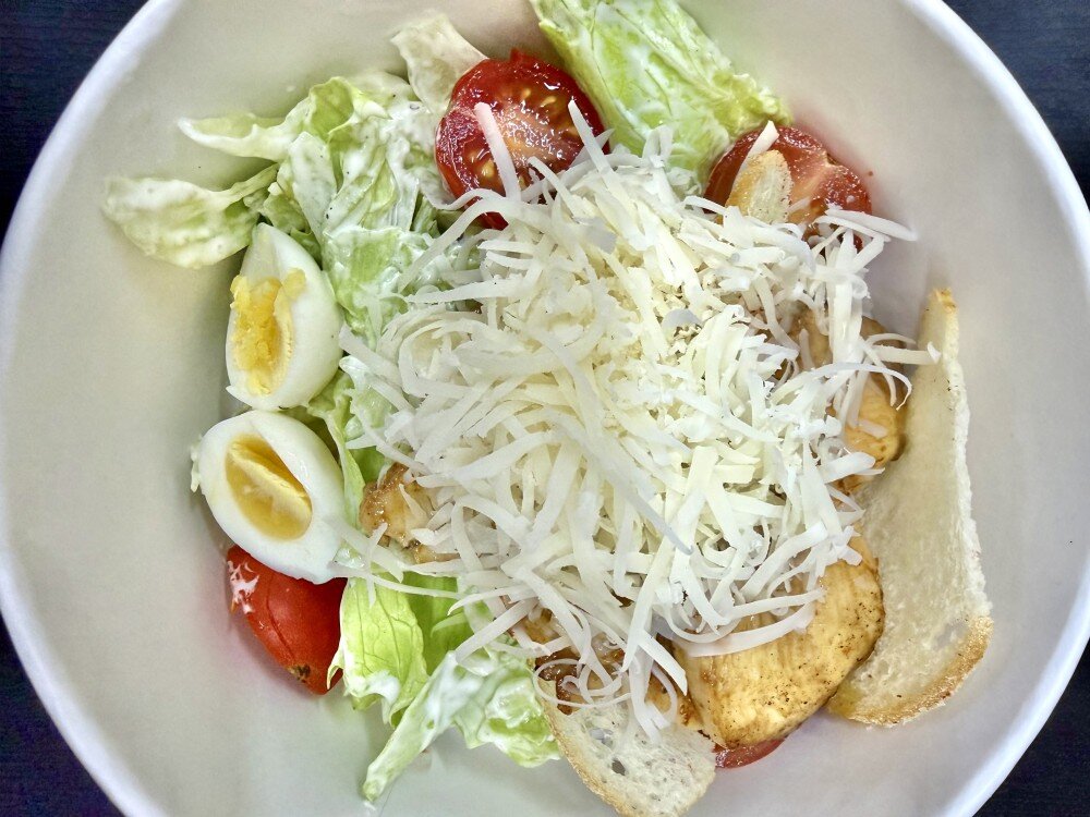 Салат "Цезарь" с куриной грудкой, сухариками, черри, перепелиными яйцами, сыром пармезан и соусом "Цезарь"