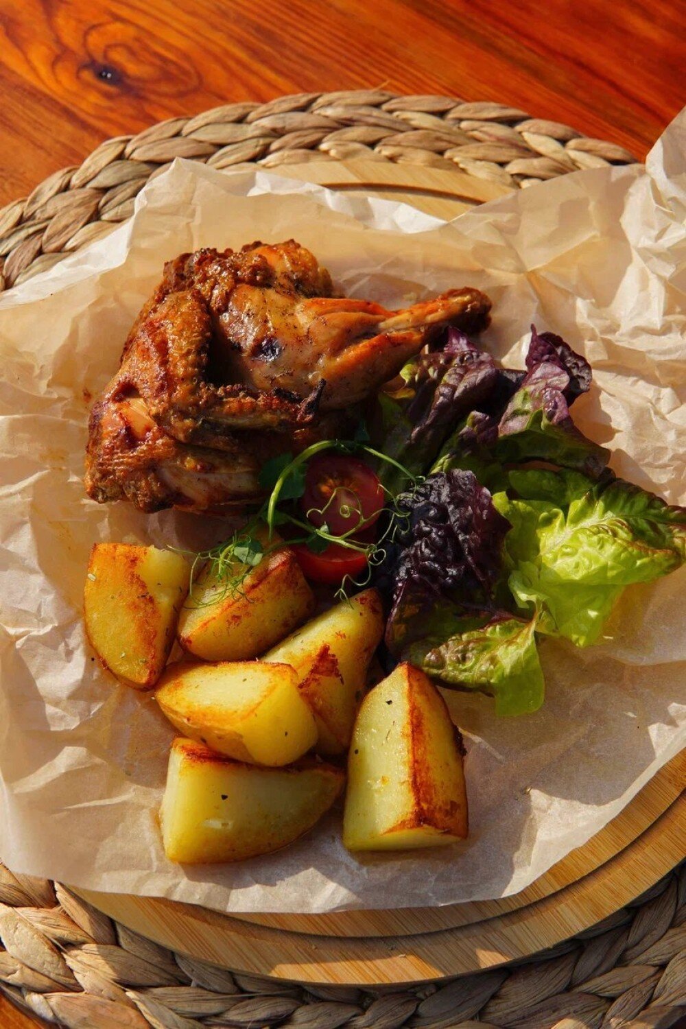 Домашний цыпленок с чесноком и зеленью, подается с аджикой собственного производства и картофельными дольками