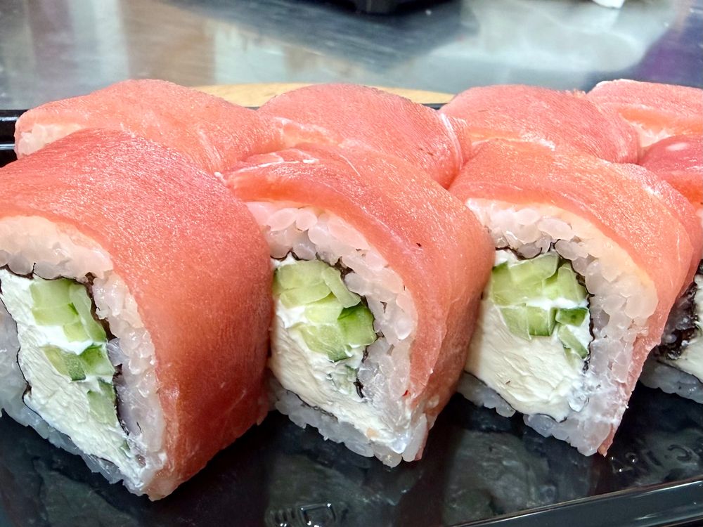 Филадельфия с тунцом, творожным сыром и свежим огурцом. В комплекте соевый соус, имбирь, васаби и палочки.