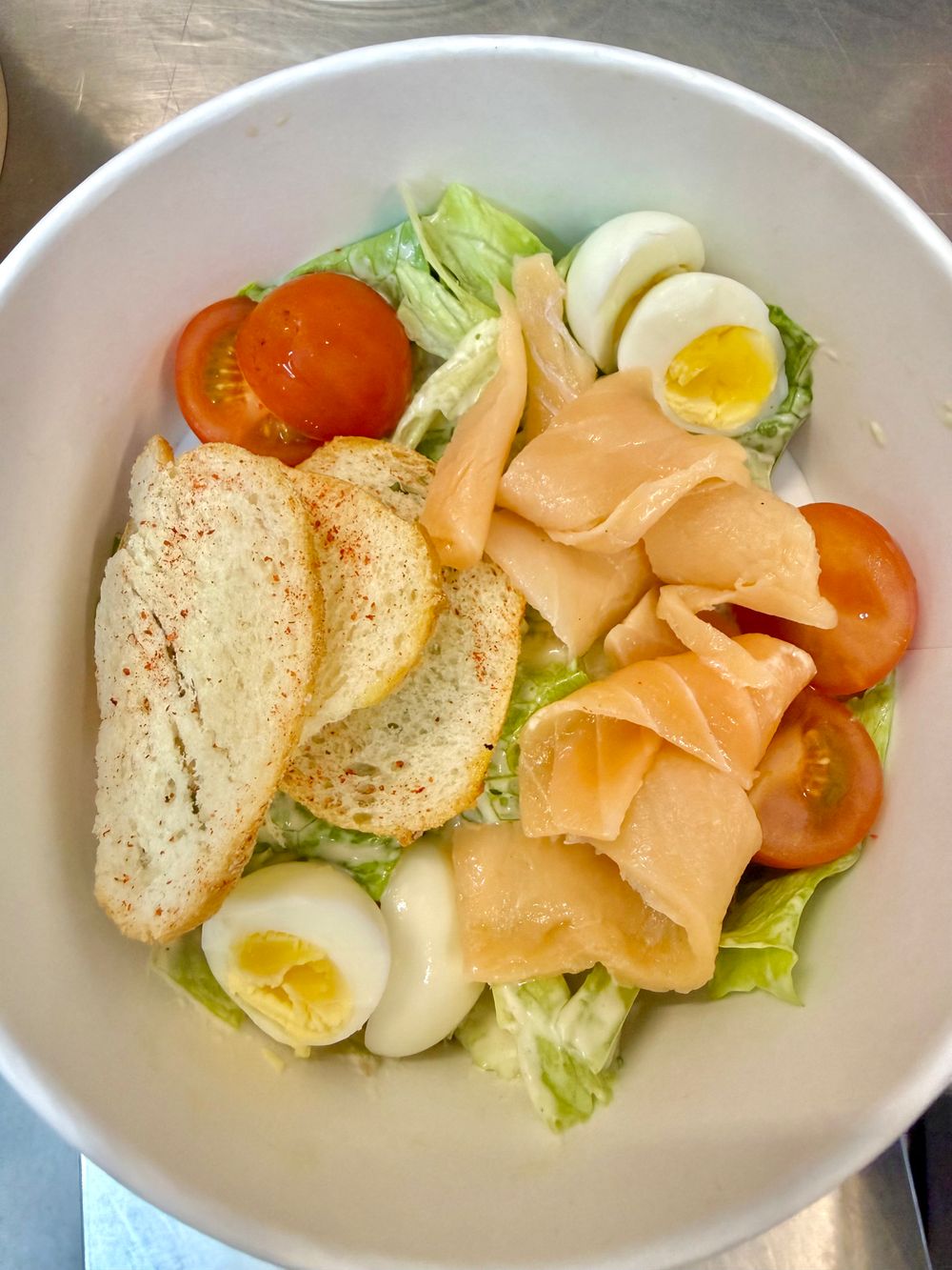 Цезарь с малосольным лососем фирменного посола. В составе черри, сыр пармезан, микс салата, сухарики и соус "Цезарь"